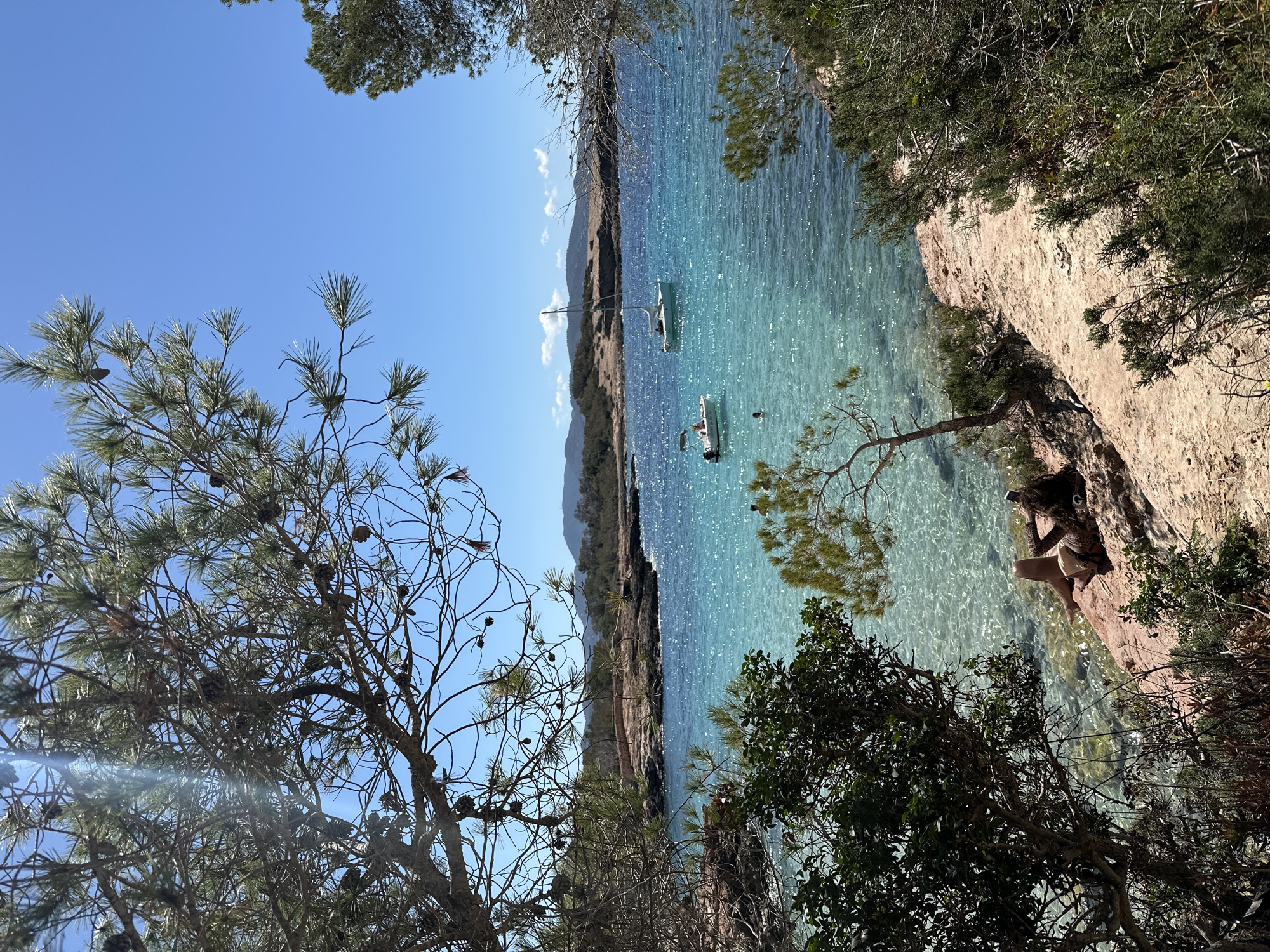 cove in Sant Antoni de Portmany, Spain. The view is partially framed by trees in the foreground. Clear turquoise water fills the cove, reflecting sunlight. Two boats are anchored in the bay, and a person is swimming nearby. On the right side of the cove, a woman sits on a rocky outcrop, facing the water and holding a phone. The opposite side of the cove is a rocky coast. The sky is blue with sparse clouds.