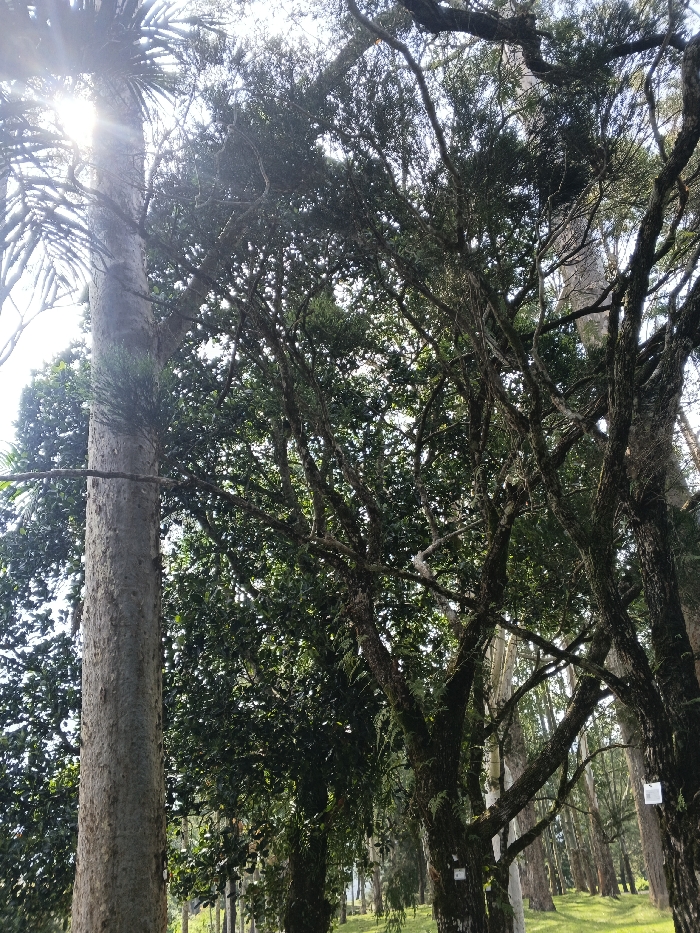 The image showcases a lush forest scene with tall trees reaching towards the sky. Sunlight filters through the dense canopy, creating a dappled effect. The bark of the trees is textured, and some branches are adorned with small ferns. In the background, a grassy area is visible, suggesting a park or open woodland. White labels are attached to some of the trees. The overall impression is one of natural beauty and tranquility.