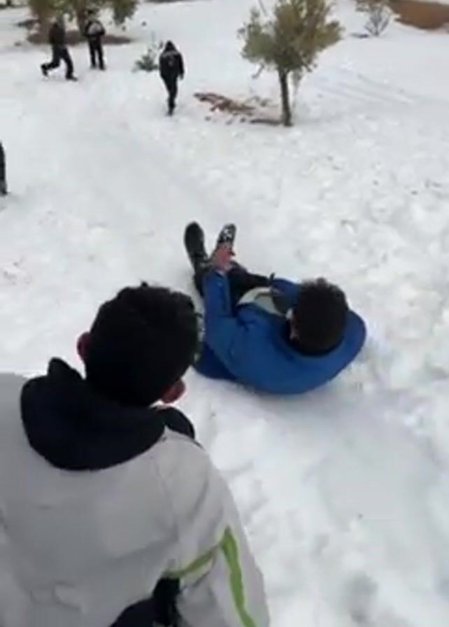 A group of people is playing in the snow in an open, hilly field with sparse trees. One man in a blue puffer jacket slides down a snow-covered hill on his back while others run in the background. One person walks toward the camera holding a large clear plastic bag. The snow covers the ground completely, and there are patches of bare earth visible. The weather appears overcast. The camera is mostly still but slightly shaky.
