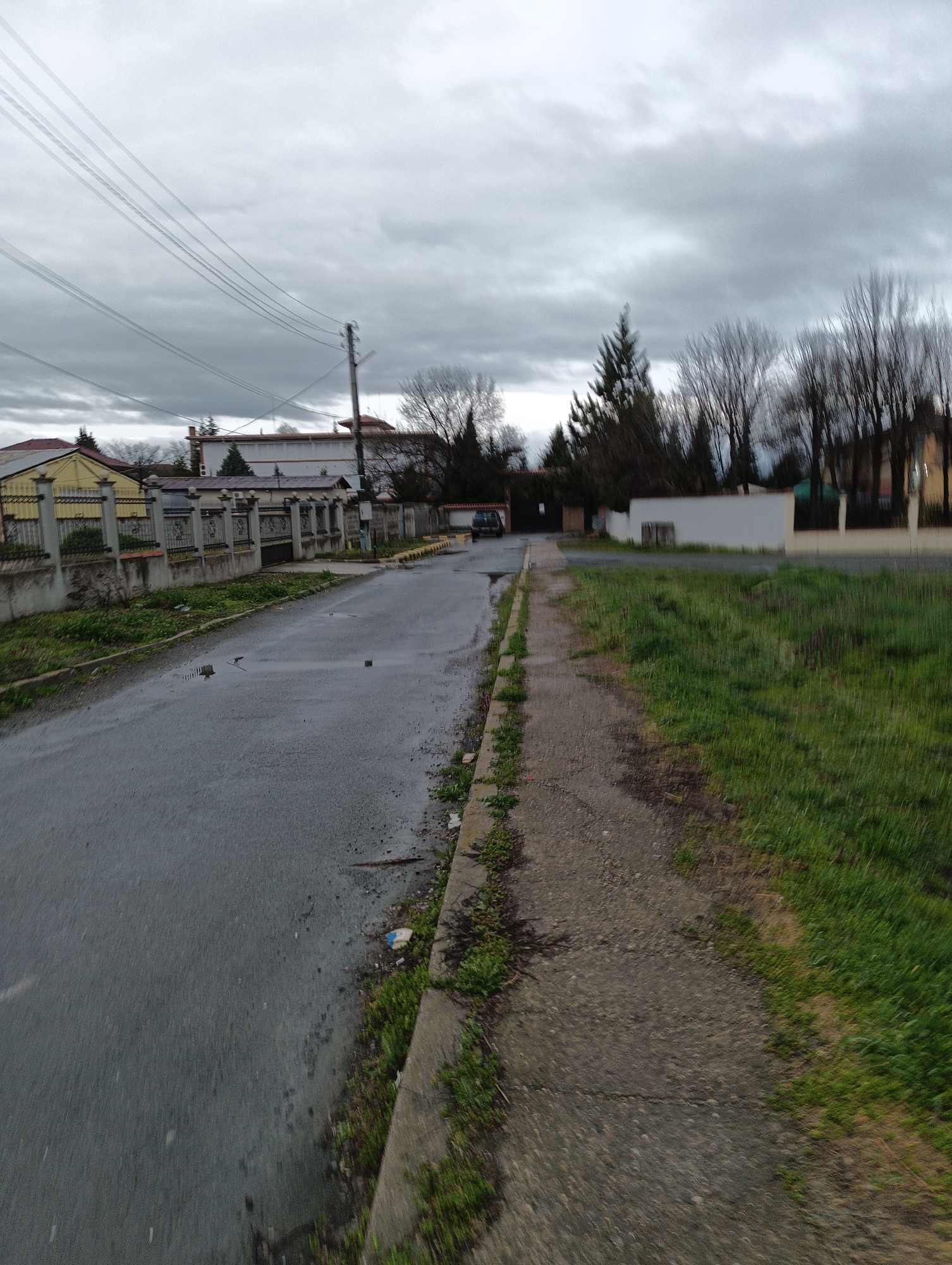 street in Karnobat, Bulgaria under an overcast sky. The road surface is wet, suggesting recent rainfall. On the left is a fence constructed of concrete posts with decorative metal infills, running along residential property. The curb separates the road from a narrow strip of vegetation. The right side of the image features a concrete sidewalk bordered by a patch of green grass. In the distance, a dark-colored vehicle is parked on the street. Power lines are visible against the sky. Bare trees are interspersed amongst evergreen trees in the background.