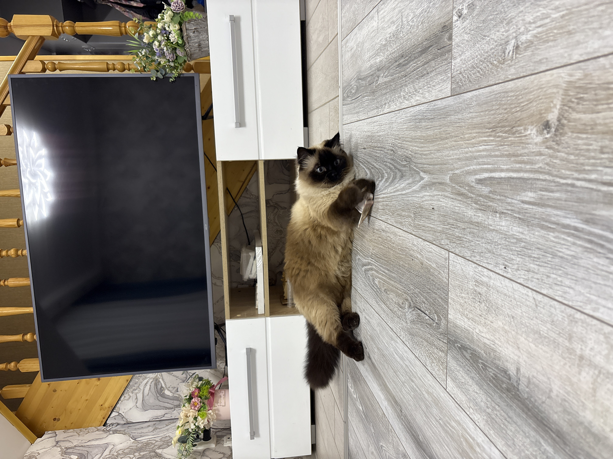 A domestic long-haired cat with a dark brown face, brown body, and dark brown tail is lying on light grey wood-look floor tiles. The cat is holding a small white object in its paws. Behind the cat is a white cabinet with a long, silver handle and an open shelf with white objects inside. To the left of the cabinet is a large, flat-screen television mounted near a wooden staircase. A small bouquet of flowers is visible near the base of the television. The scene is indoors, likely in a private residence. The location in the city of Simferopol, Ukraine, is based on implicit information and cannot be verified solely from the visual data.