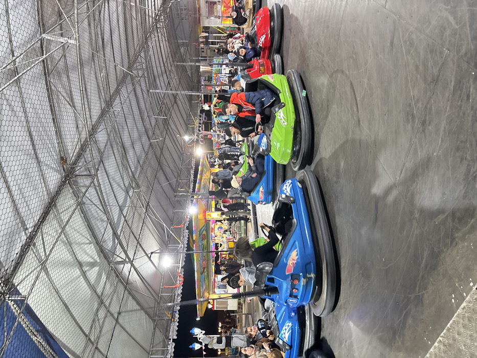 Bumper cars line up in a brightly lit indoor amusement park. Cars are red, green, and blue, each carrying one or two riders. Many people stand and watch in the background. An intricate metal structure forms the roof, covered with a fine mesh netting. The ground appears to be a polished concrete surface. Decorations and lights add to the festive atmosphere.