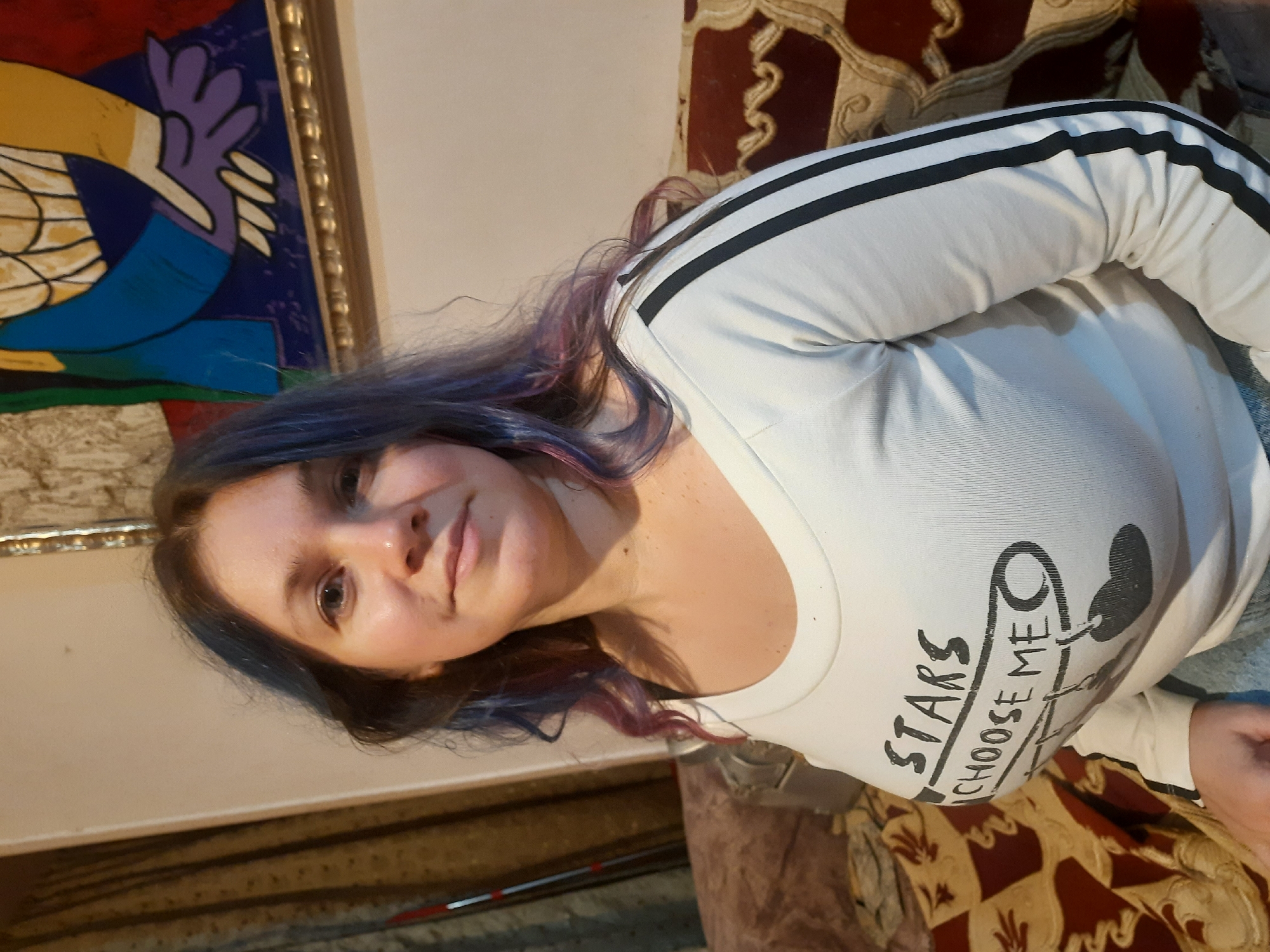 A woman with dyed blue and purple hair is indoors, sitting on a brown patterned couch. She wears a white long-sleeved shirt with three black stripes on the shoulder and the text "Stars Choose Me" printed on it. To the left, there is a framed painting hanging on the wall. The location is in Al Hadaba, Egypt.