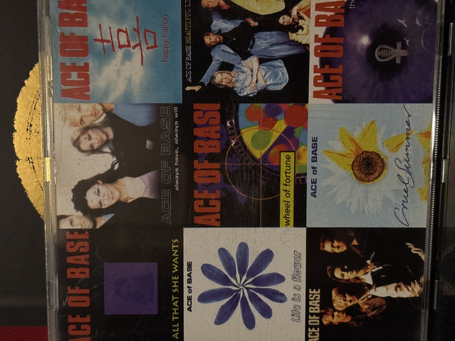 The image displays a collection of nine compact disc (CD) covers or album art from the musical group Ace of Base, arranged in a 3x3 grid within a transparent protective sleeve. This scene is located in Meistratzheim, France. **Essential Details:** * **Subjects/Objects:** * **Top Row (Left to Right):** * **Cover 1:** Black background with "ACE OF BASE" in red and "ALL THAT SHE WANTS" in white. A blurred purple square contains a faint silhouette of a person. * **Cover 2:** Black background with "ACE OF BASE" and "always have, always will" in white. Features a promotional photo of three members of Ace of Base: a man on the left, a dark-haired woman in the center, and a blonde woman partially visible on the right. * **Cover 3:** Light blue sky background with "ACE OF BASE" in red, a red Chinese character (喜 - 'joy'), and "happy nation" in white. * **Middle Row (Left to Right):** * **Cover 4:** White background with "ACE OF BASE" and "Life is a flower" in black. A stylized blue eight-petal flower is centered. * **Cover 5:** Dark background with "ACE OF BASI" (partially visible) in red and "wheel of fortune" in yellow. A colorful, abstract circular design is prominent. * **Cover 6:** Black background with "ACE OF BASE BEAUTIFUL LI" (partially visible) in white. Features four members of Ace of Base in a promotional photo; a blonde woman, a man in a light blue suit with raised arm, another man, and a woman seated in front. * **Bottom Row (Left to Right):** * **Cover 7:** Dark background with "ACE OF BASE" in white. Features a promotional photo of four members of Ace of Base. * **Cover 8:** Light blue background with "ACE OF BASE" in blue and "Cruel Summer" in cursive script. A stylized yellow sunflower is centered. * **Cover 9:** Purple background with "ACE OF BA" (partially visible) in red. A silver female symbol (♀) is central, accompanied by small white bird-like figures and delicate plant elements. * **Environment:** The collection is housed within a clear plastic sleeve or binder page, showing light scratches on its surface. The background behind the sleeve appears dark and undefined. Above the sleeve, a blurred section of golden-yellow, textured material is visible. Below, a dark, reflective surface, possibly part of a shelf or table, is present. * **People/Actions/Interactions:** No live people are depicted in the image; all human figures are static images on album covers. No actions or interactions are occurring within the frame.