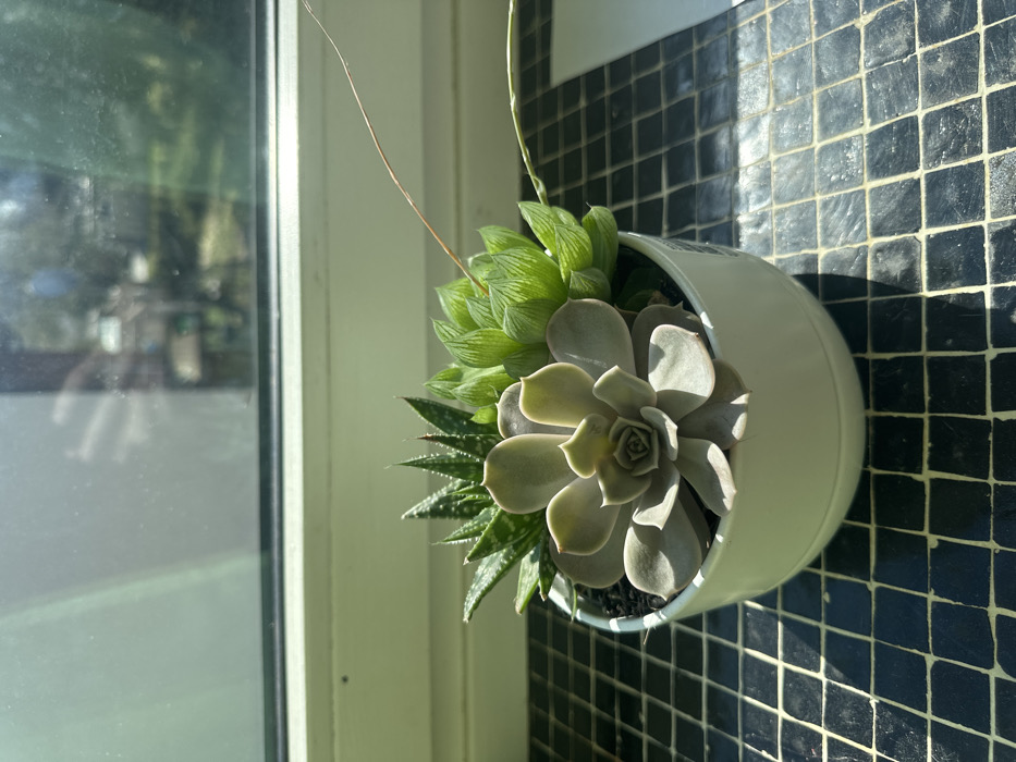A white, half-moon shaped ceramic pot containing three succulent plants rests on a dark tiled window sill in a city, location Unknown, Unknown