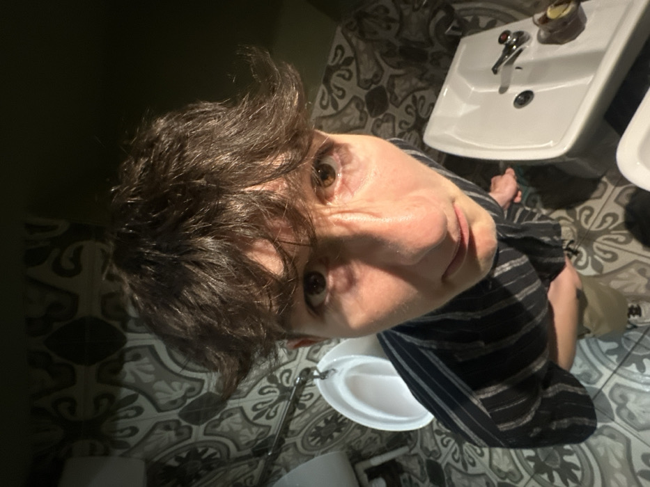 The image is taken in a bathroom with black and white tiled floors. A man is standing, looking down at the camera. He is wearing a black and white striped shirt. There is a white urinal to the left of the image. There is a white sink to the right, with a silver faucet and a small glass of liquid on the counter. The scene is lit from above. The location is 54.971 latitude, -1.613 longitude. The image appears to have been taken in a public bathroom in Newcastle upon Tyne, United Kingdom.