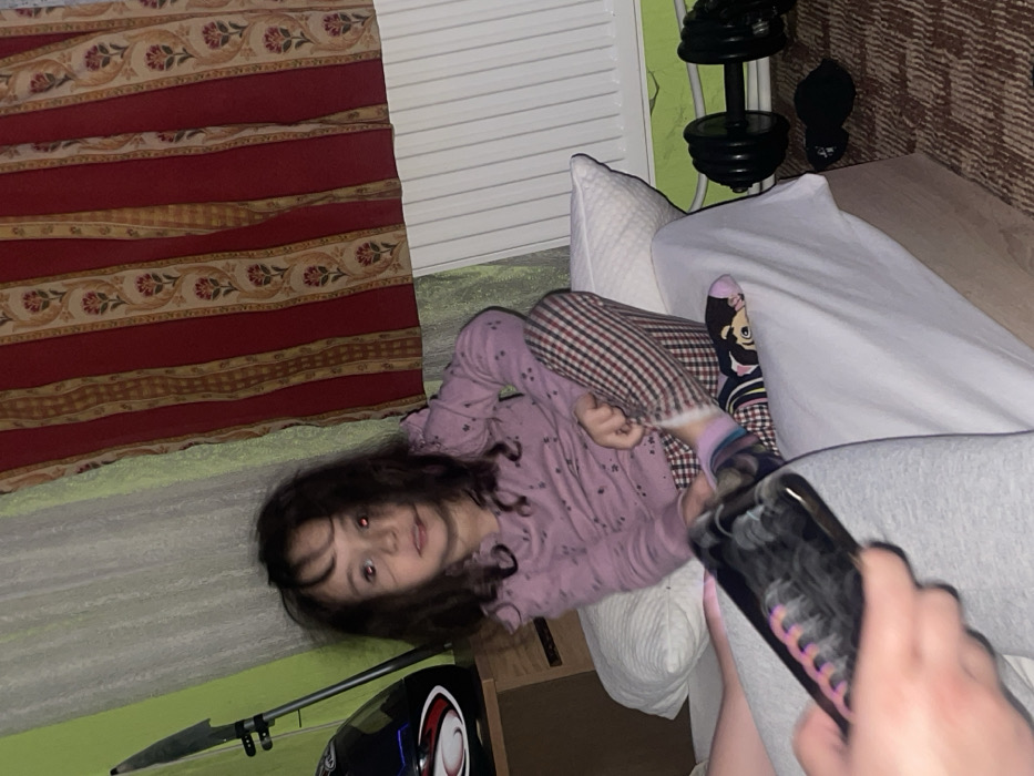 This image depicts an indoor domestic setting, specifically a bedroom or similar living space. The precise location within the city of Silistra, Bulgaria, cannot be visually confirmed from the image itself. The scene is illuminated by artificial light, likely a camera flash, given the "red-eye" effect present in the subject. The primary subject is a young girl, estimated to be between 3 and 6 years old, with dark, disheveled, shoulder-length hair. She is wearing a light purple long-sleeved top with small dark motifs, plaid trousers (red, black, and white pattern), and mismatched patterned socks, one featuring a light blue cuff and a character graphic. She is seated on a white-sheeted bed, with her left leg bent and her foot raised, facing generally towards the viewer with a neutral to slightly open-mouthed expression. To the left of the child, a light brown wooden nightstand or small chest of drawers is visible, supporting a black motorcycle helmet with white and red accents. Leaning against the vibrant lime green wall behind the nightstand is a long, slender pole-like object with a pointed tip, resembling a spear or a decorative weapon. In the foreground, the lower torso and hands of an adult are partially visible, wearing light grey trousers. The adult is holding a dark-colored smartphone horizontally, its screen (showing a blurred, possibly animated or patterned image) facing away from the viewer. To the right side of the image, a white, horizontally-finned radiator is mounted on a lighter green wall. Below the radiator, on a patterned carpet featuring dark brown and lighter geometric designs, rests a black dumbbell with multiple weight plates, along with another smaller dark object. The background includes a sheer, light-colored curtain on the left and a dominant red curtain with vertical light-colored stripes adorned with repeating floral patterns on the right.