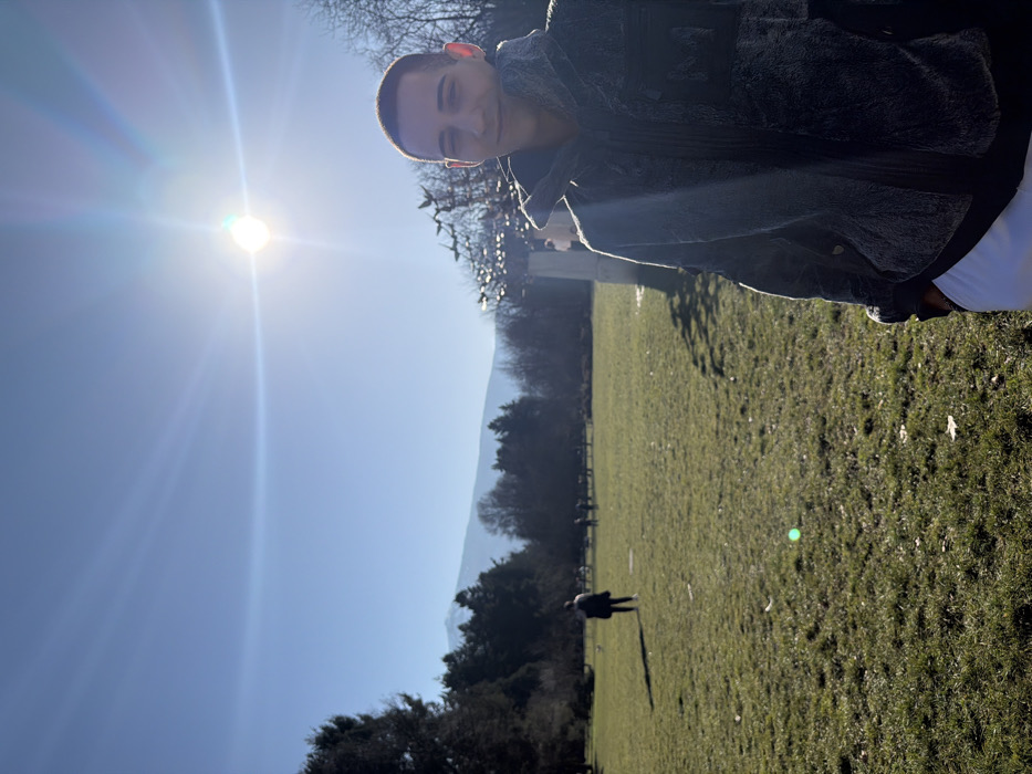 The image displays an outdoor scene in Sofia, Bulgaria, within a large urban park, likely Borisova Gradina, with Vitosha Mountain visible in the distant background. A young male, appearing to be in his mid-20s, with short dark hair, is positioned in the right foreground, facing the camera with a slight smile. He is wearing a dark, textured, possibly fleece or sherpa-style zippered jacket over a dark layer, with white pants visible below. The sun is positioned in the upper right of the frame, causing significant lens flare and strong illumination. To the immediate right of the foreground subject, a light-colored, possibly concrete or stone, structure with bare branches overhead is partially visible. The central and left portions of the image consist of a wide, sunlit green grassy field. In the mid-ground, an individual wearing a dark jacket and light pants walks away from the camera. Multiple smaller, indistinct figures are scattered further across the field in the background. A dense line of trees, including both coniferous and bare deciduous varieties, defines the far edge of the parkland. Beyond the trees, the snow-covered slopes of Vitosha Mountain are visible under a clear, bright blue sky.