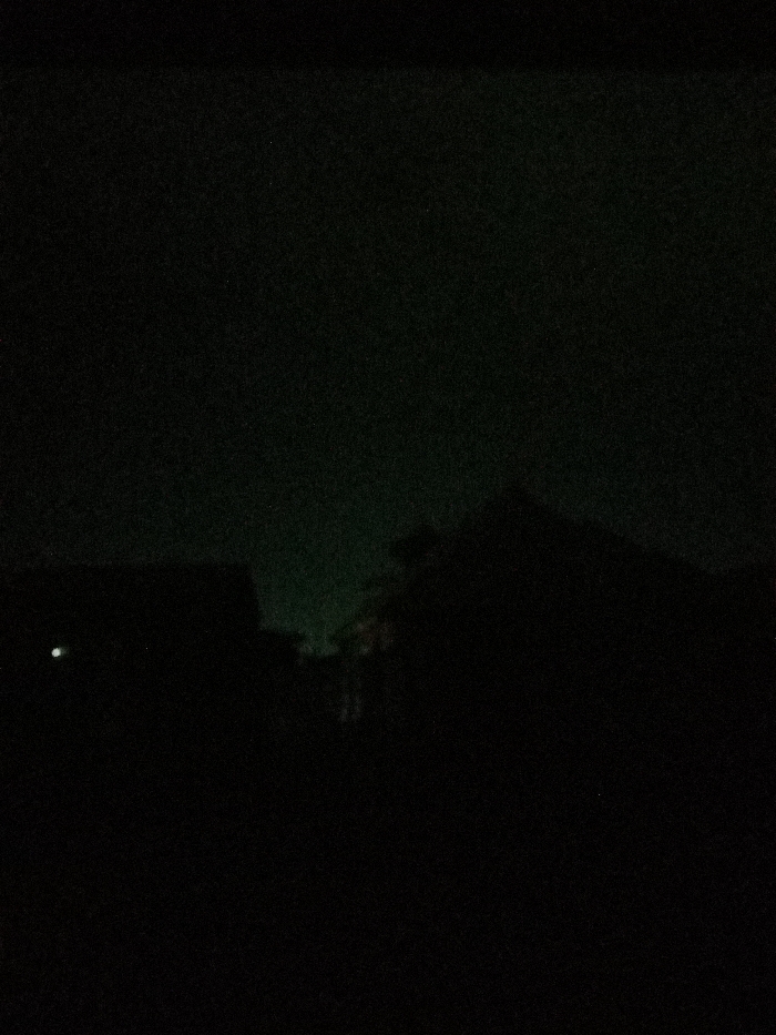A dimly lit outdoor scene at night. A dark sky hovers over the landscape, barely illuminated with a faint green hue. In the foreground, dark silhouettes of buildings and trees dominate, their forms indistinguishable in the low light. A single, small point of light is visible near a building. The overall impression is of a quiet, dark night scene.