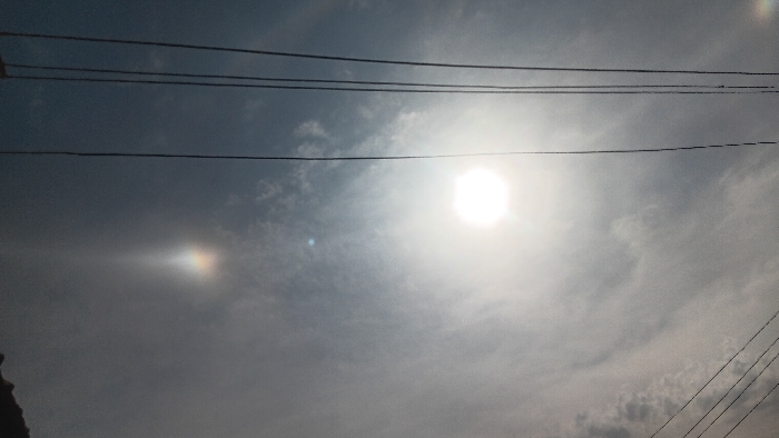 The scene depicts a partially cloudy daytime sky above Jos, Nigeria. The sun, a brilliant white light source, is prominently positioned in the upper right quadrant. To the sun's left, a distinct parhelion (sun dog) is visible as an elongated, horizontally extended luminous patch exhibiting faint rainbow coloration. Multiple dark, thin utility wires traverse the frame; three parallel wires are visible across the upper section, and three more are present in the lower right. A dark, indistinct shape is partially visible in the extreme bottom-left corner. No individuals or specific actions are discernible within the frame.