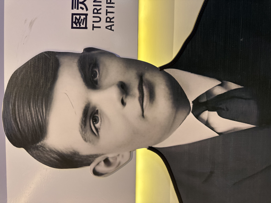 A two-dimensional, monochrome cutout of Alan Turing is prominently displayed, depicting him from the chest up