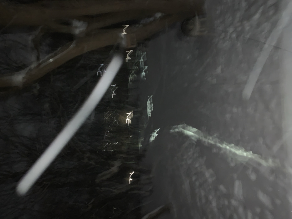 A blurry image displays a dark, wintery scene, possibly at night. A light-colored branch stretches across the top left. Streaks of light, maybe from distant buildings, are vertically oriented. A diagonal, white shape dominates the left side, potentially a snow-covered object illuminated by the lights. A dark, indistinct mass appears on the right, possibly a snow-covered surface or dense foliage. The overall effect is motion or blur, making it difficult to discern distinct objects.