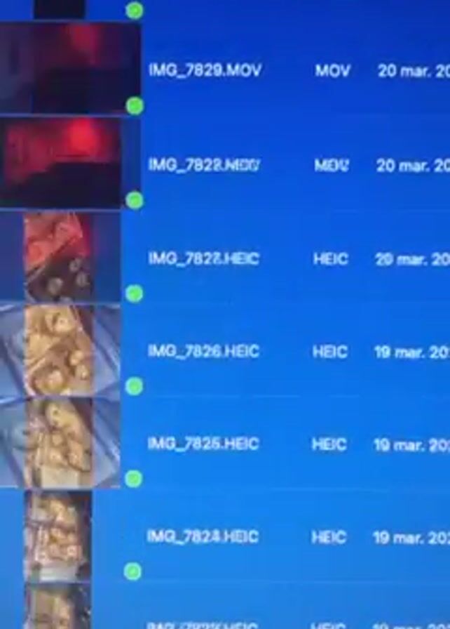 computer screen displaying a directory of image and video files, organized in columns showing the file name, type, and date