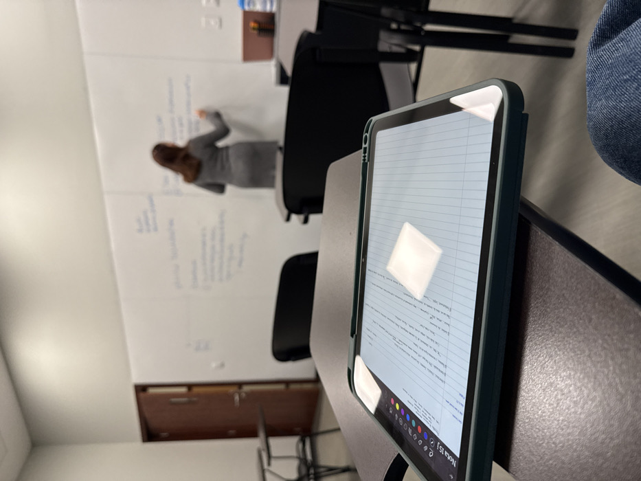 The scene depicts an indoor classroom or lecture environment located in Tizapan, Mexico. In the immediate foreground, a dark-colored tablet encased in a green protective cover rests on a dark brown desk surface, displaying digital notes with a title "Nota (5)" and prominent reflections from overhead lighting. The lower right corner reveals a portion of a person's legs, clad in blue jeans, indicating the photographer's seated position. In the midground, multiple black chairs with attached dark brown desks are arranged, predominantly unoccupied. A dark brown wooden door with a silver handle is visible on the left. In the background, a person with shoulder-length brown hair, wearing a gray dress or tunic, stands with their back to the viewer, writing on a large white board covered with blue marker text and diagrams. To the right of the whiteboard, a small, light brown container holds a blue water bottle and other objects on a desk.