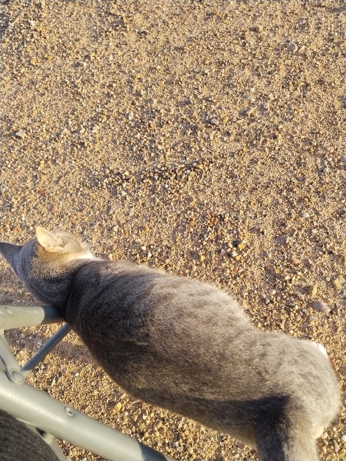 The image depicts a gray domestic cat (Felis catus) in an outdoor environment in Lo Ferro, Spain. The cat is positioned horizontally, with its dorsal side facing the viewer and its head oriented towards the upper-left quadrant of the frame. Its forelimbs rest upon a light gray, tubular metal structure, possibly a chair leg or railing, which extends diagonally across the lower-left corner. The cat's fur exhibits varying shades of gray, with lighter tones on its ears and underside. The surrounding ground consists of numerous small, irregularly shaped gravel or pebbles in hues of tan, beige, and light brown, suggesting a dry, unpaved surface. Direct sunlight illuminates the scene, creating bright highlights and distinct shadows, consistent with an outdoor daytime setting. No human subjects are visible.
