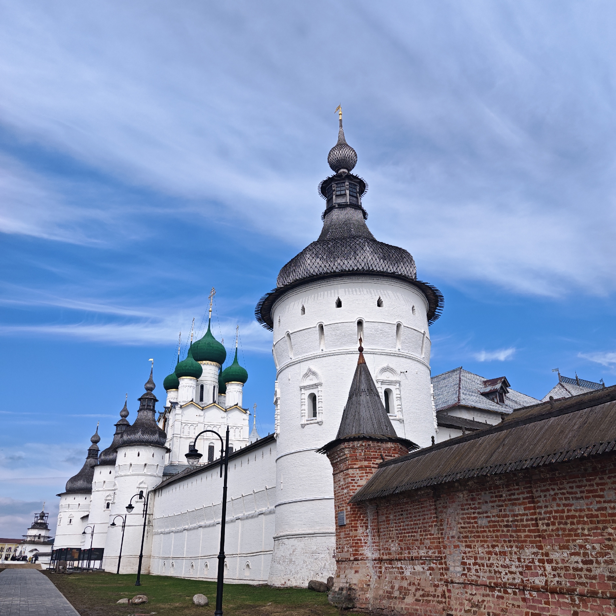 The image captures the Rostov Kremlin in Rostov, Russia, under a sky marked by sparse, wispy clouds. The scene prominently features the white, fortified walls and towers of the Kremlin, contrasted by a lower brick wall running along the right side. The towers are capped with dark, textured roofs, while a series of green-domed churches rise behind the white walls. Street lamps line a path that extends along the base of the wall on the left, and the surrounding ground shows patches of grass. The buildings and structures reflect historical architectural styles typical of Russian Orthodox buildings.