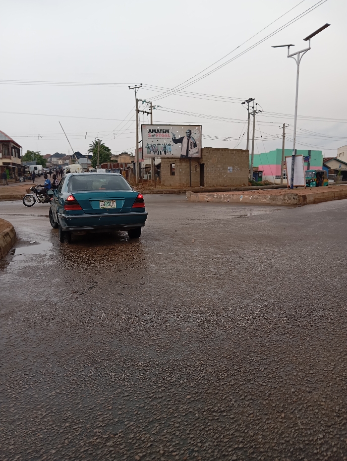 street intersection in Kuru Karama, Nigeria. A blue car is parked in the center of the intersection, facing the camera. The car is slightly angled to the left. Two people are visible in the distance near the car. To the left of the car is a motorcycle with a person riding it. To the right of the car, a billboard can be seen, which advertises a political campaign. The street is paved with asphalt, and there are puddles of water on the street. The sky is overcast, and there are power lines running overhead. The buildings in the background are made of concrete and have flat roofs. There are trees in the background.