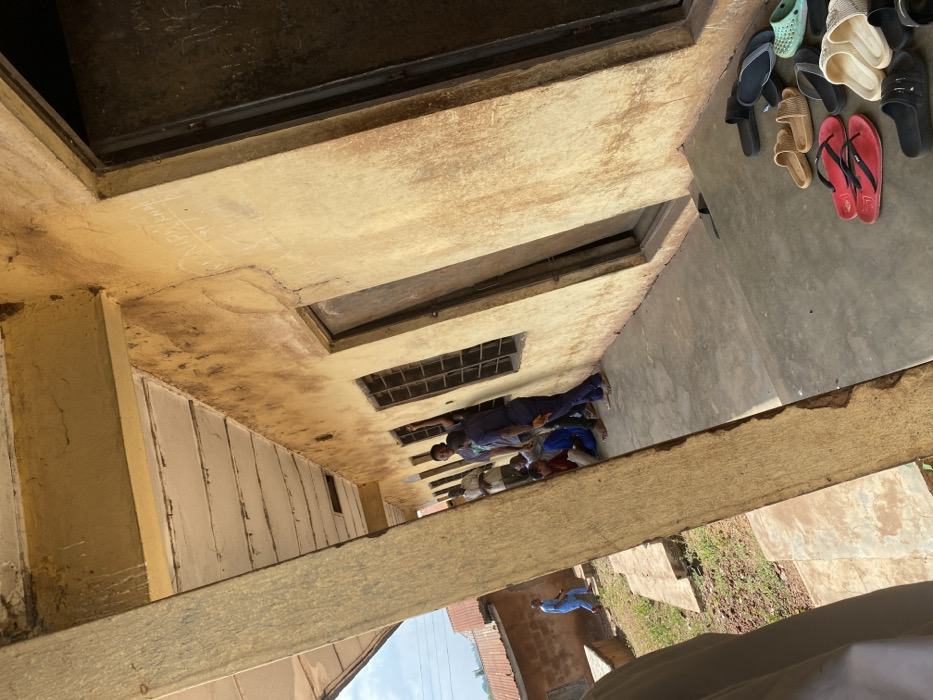 The image depicts the exterior of a weathered, single-story building with a covered walkway in Ameka, Nigeria, under bright daylight conditions