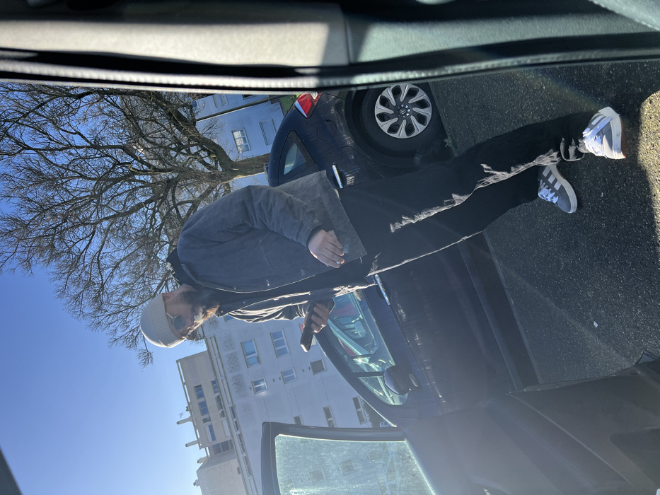 The scene depicts an outdoor urban environment in Hérouville-Saint-Clair, France, under a clear blue sky. A male individual stands in the mid-ground on asphalt pavement. He wears a light-colored beanie, sunglasses, a dark hooded jacket, black trousers, and grey and white Adidas sneakers. He has a dark beard. He holds a dark-colored smartphone in his left hand, appearing to observe its screen. A lit cigarette is held in his right hand, with smoke visibly emanating. To the left of the individual, the driver's side front door of a dark-colored car is open. Behind him, a dark-colored hatchback, consistent with a Citroën C3, is parked. In the background, a large deciduous tree with bare branches is prominent, flanked by multi-story residential buildings with light-colored facades. The scene is illuminated by bright sunlight.