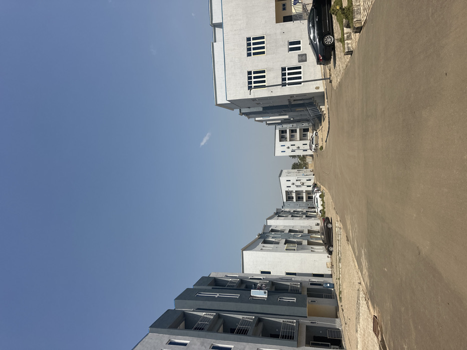 The scene depicts a modern residential development in Karum, Nigeria, under a clear, bright blue sky featuring a single wispy cloud