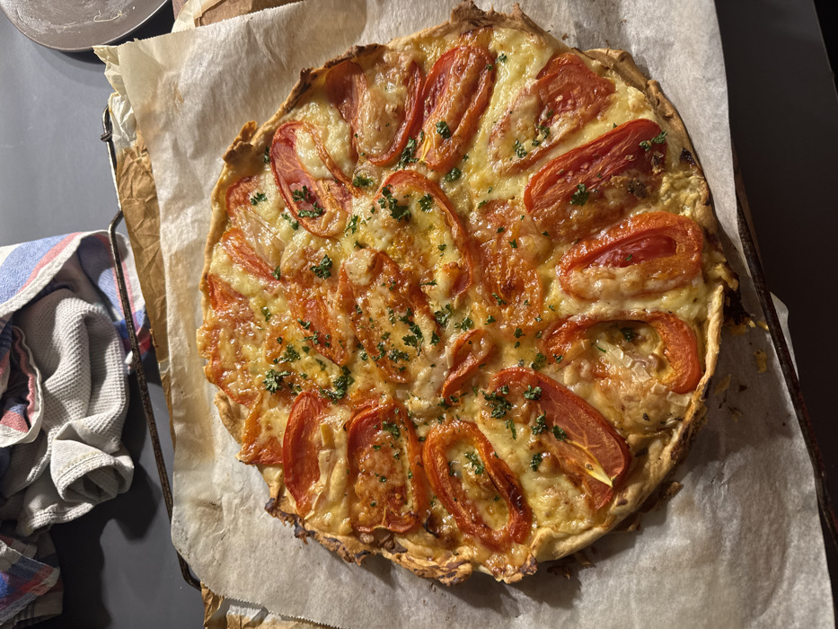 - "A freshly baked tomato tart on parchment paper atop a metal rack" by FM-vvp7l1, licensed under CC BY 4.0