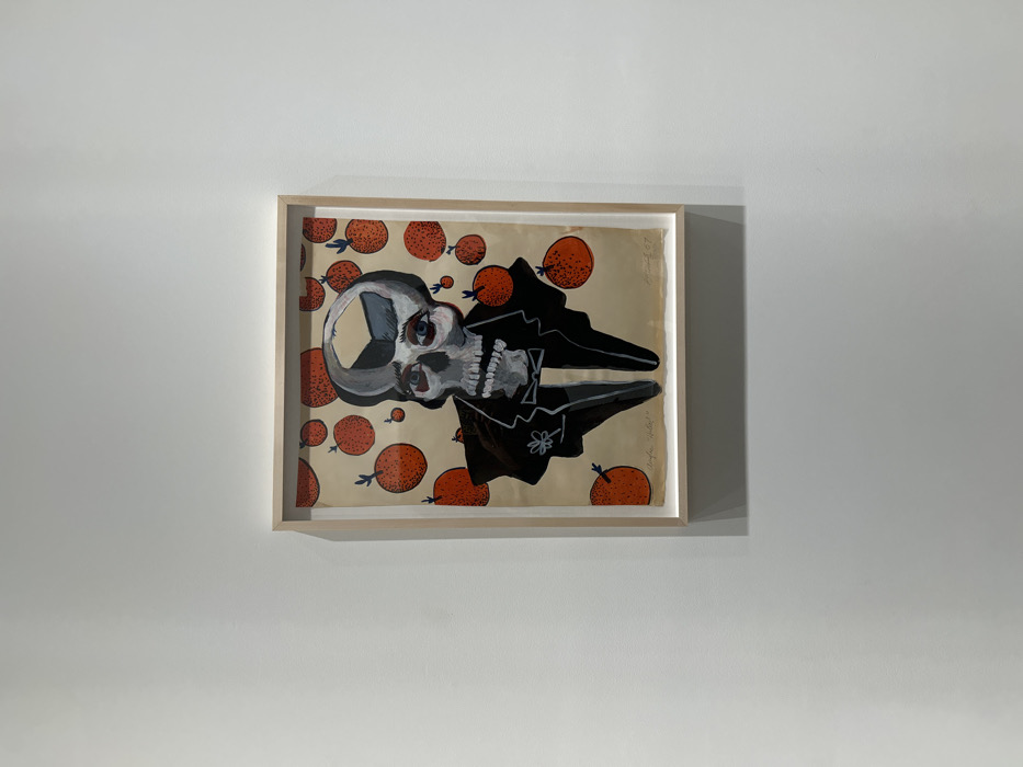A framed painting hangs on a white wall. The artwork features a skull with distinct eye sockets, set against a background of orange fruit. The skull is adorned with a black jacket featuring a flower emblem. The frame is light-colored and thin. The painting's color palette is dominated by white, black, and orange. The art is mounted on the wall at eye level.