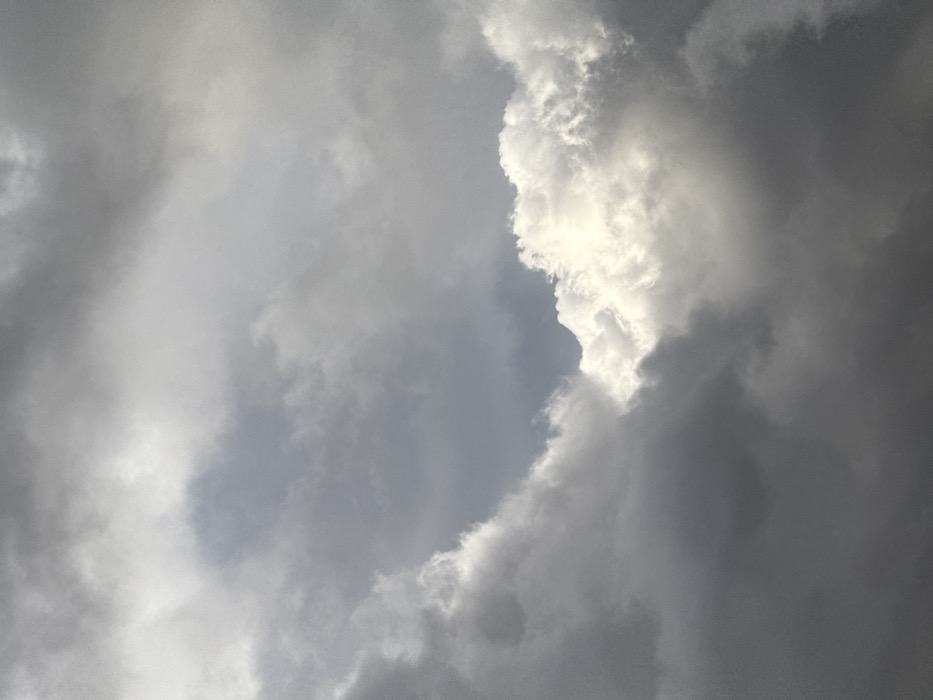 The image depicts a sky view in Niederanven, Luxembourg, dominated by extensive cloud cover. The scene features a central, irregular, roughly oval-shaped opening within the clouds, revealing a slightly darker, muted blue-grey sky beyond. Surrounding this opening are varying formations of cumulus and stratocumulus clouds. The lower right portion of the opening is bordered by significantly brighter, illuminated white clouds, indicative of direct sunlight breaking through. Other clouds range from light grey to dark grey, exhibiting diverse textures and densities. No people, discernible objects, or specific actions are present in the frame.