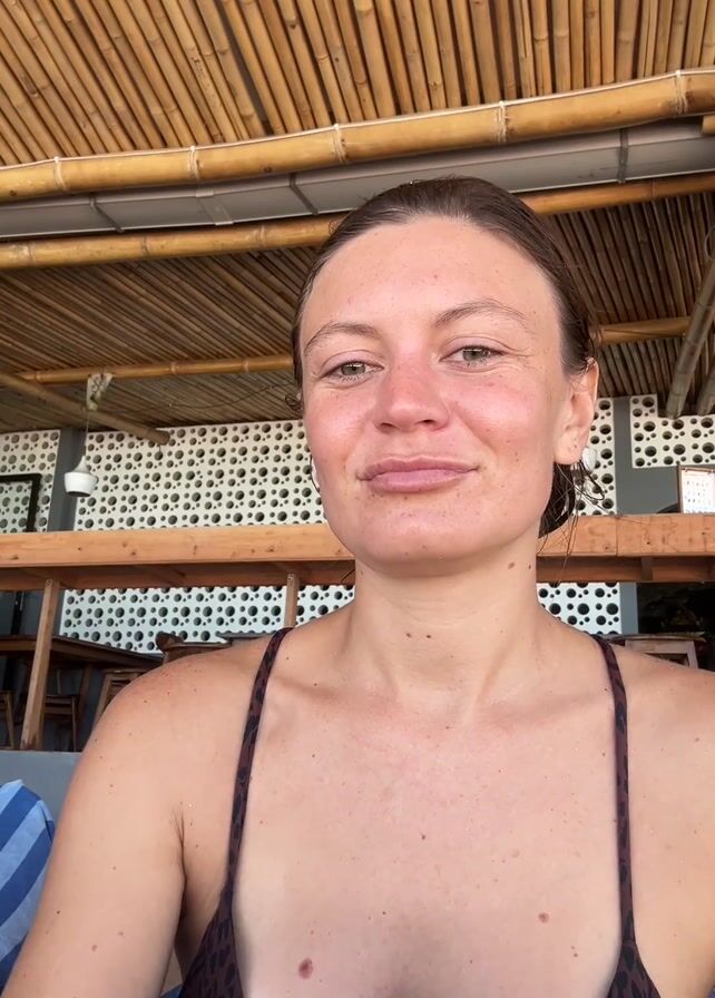 A woman with light skin, light brown hair pulled back, and wearing a dark bikini top, is indoors with a bamboo ceiling above