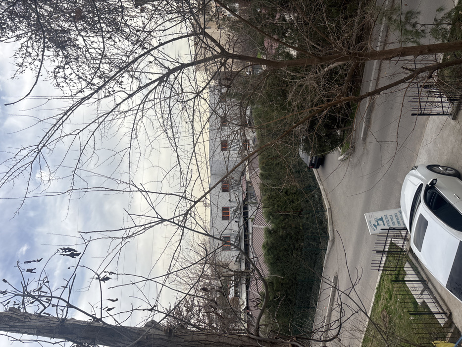 This image depicts an urban exterior scene in Tashkent, Uzbekistan, viewed from an elevated perspective, likely a window or balcony, under an overcast sky. In the immediate foreground, bare deciduous trees with visible branches frame the left and right sides of the image, suggesting a winter or early spring setting. A white sedan, equipped with a sunroof, is parked on a paved surface in the lower left quadrant, adjacent to a low black metal fence. A white rectangular sign, positioned next to the sedan and fence, displays blue Cyrillic text and a graphic of a shirt on a hanger. The text translates to "Workshop: Alteration, Dyeing, Dry Cleaning of Garments." A paved asphalt road curves from the lower center toward the right, bordered by a low white curb and dense green hedges. Further down this road, a dark-colored SUV is partially visible, parked on the right side, largely obscured by tree branches. Beyond the hedges, several low-rise buildings with brown corrugated roofs are visible. In the background, a large, light-grey industrial-style building with multiple rectangular orange-framed windows stands prominently against the cloudy sky. No individuals are present in the visible scene, and no specific actions or interactions are depicted.