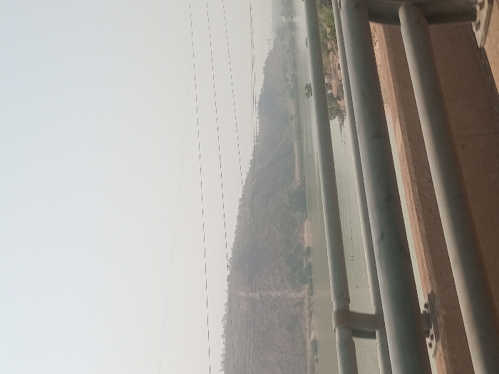 The image depicts a hazy, wide view of the Niger River from the Jebba Bridge in Jebba, Nigeria. In the immediate foreground, a grey metal bridge railing with multiple horizontal bars and vertical supports is visible, set against a concrete barrier. The river's surface, a calm greenish-brown, occupies the midground, with faint dark specks, possibly small boats or people, visible on the water. Beyond the river, on the far bank, a large, rocky hill with sparse, dry vegetation rises prominently, featuring a faint lighter-colored path or track ascending its slope. Thin, dark horizontal lines, consistent with power lines, traverse the upper midground. The sky is uniformly light grey, indicating atmospheric haze or an overcast condition. No clear individuals or specific actions are discernible.