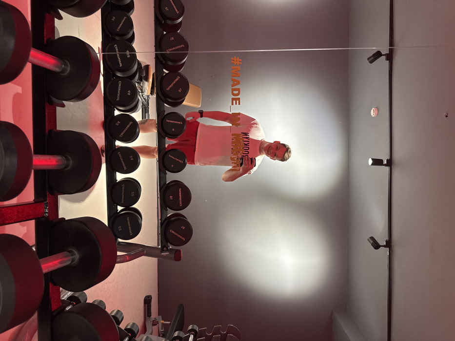 A male individual is captured in a mirror selfie within a modern gym setting in Krasnoyarsk, Russia