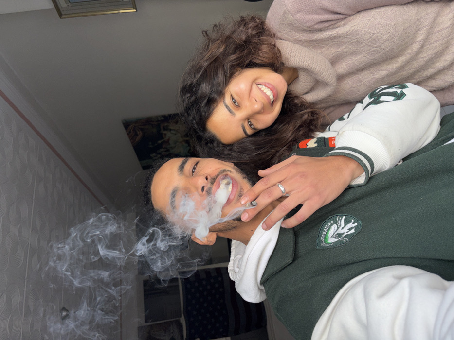The image displays two individuals, one male and one female, posing for a photograph within a residential interior in Tangier, Morocco. The male, positioned on the left, has dark curly hair, a beard, and wears a dark green letterman-style jacket with white sleeves over a white hooded sweatshirt. He is seen with a lit cigarette or hand-rolled item held between his right thumb and forefinger, actively exhaling smoke from his mouth and from the item. A silver-colored ring is present on his right ring finger. The female, positioned to the right, has dark wavy hair and wears a light brown cowl-neck knitted sweater. Both subjects are smiling and looking directly at the camera. The background reveals a textured white ceiling, light-colored walls, and partially visible decor, including a folded American flag on the left and framed artworks on both the left and right walls.