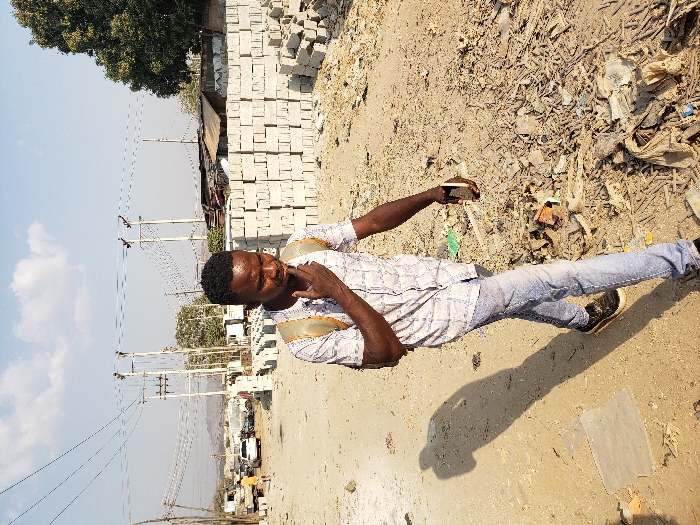 A dark-skinned male, appearing to be in his late 20s or early 30s, walks on a dusty path under direct sunlight in Idah, Nigeria