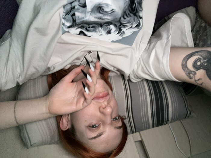 The scene takes place indoors in the city of Engels, Russia, depicting a single individual, presumably female, lying down. The individual has reddish-brown hair, fair skin, and light-colored eyes. A small mole is visible below the right eye. Her expression is neutral with slightly parted lips. She wears a white short-sleeved t-shirt featuring a large graphic print of a classical bust, appearing to be Michelangelo's David. Her left arm, visible from the bicep, displays a large, dark tattoo resembling a stylized creature or serpent. Her right hand, positioned near her face, shows long, pointed fingernails with a black tip over a light base. A thin silver-colored chain bracelet is on her right wrist, and a silver-colored chain necklace with a small pendant is visible around her neck. Her head rests on a pillow with horizontal grey, white, and black stripes. Part of a light-colored headboard or wall is visible above the pillow, and a dark purple or grey surface, likely bedding, is seen in the foreground and to the left. The image is captured from an elevated, downward-angled perspective.