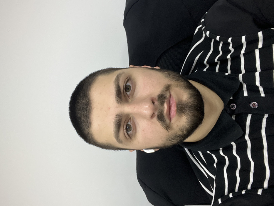 The image displays an adult male seated indoors in Tbilisi, Georgia. He has a fair to medium skin tone, short dark hair in a buzz cut, and a trimmed dark beard and mustache. His eyes are brown, and he maintains a neutral expression while looking directly at the viewer. He is wearing a black polo shirt with thin white horizontal stripes and a two-button placket. A white wireless earbud is visible in his left ear. He is positioned in what appears to be a black chair, with part of the headrest visible, against a plain, light grey wall.