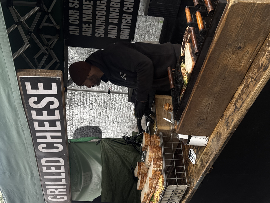 - "An outdoor food stall, operating under a green canvas canopy in the city of London, United Kingdom, features a vendor preparing grilled cheese sandwiches" by FM-Q10cY2, licensed under CC BY 4.0