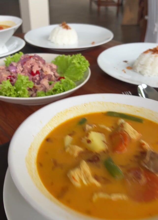 table at a restaurant set for a meal. There are two bowls of orange soup with chunks of chicken and vegetables, two plates of white rice topped with fried onions, and a salad of chopped chicken or tuna, red onion, and lettuce leaves. There are also cutlery and blue napkins. The table is wooden and the setting appears to be relaxed and casual.