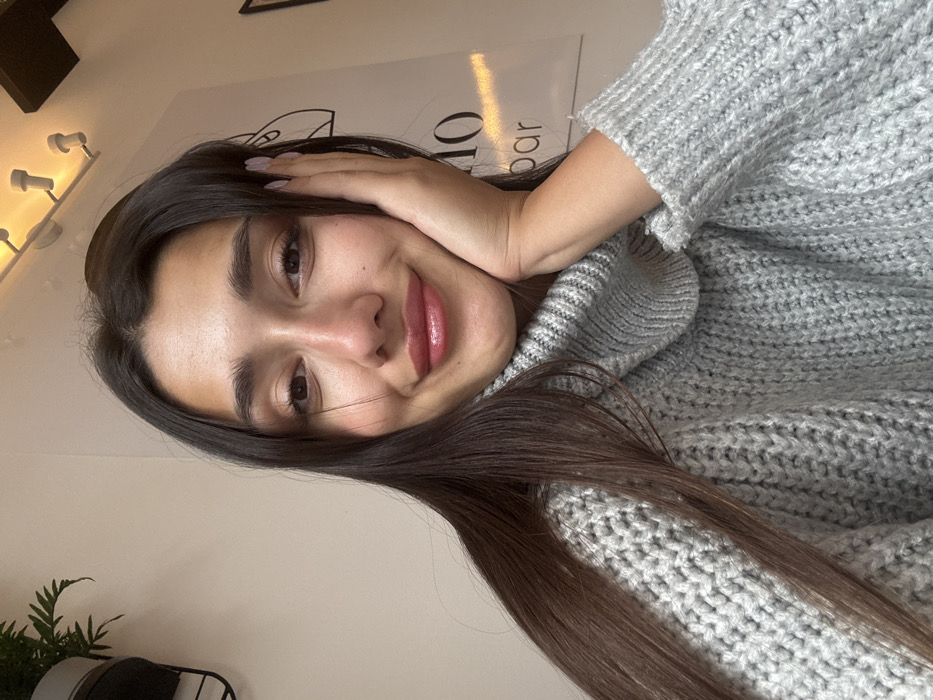 A female individual is captured in a close-up, front-facing indoor portrait, smiling slightly and looking directly at the camera