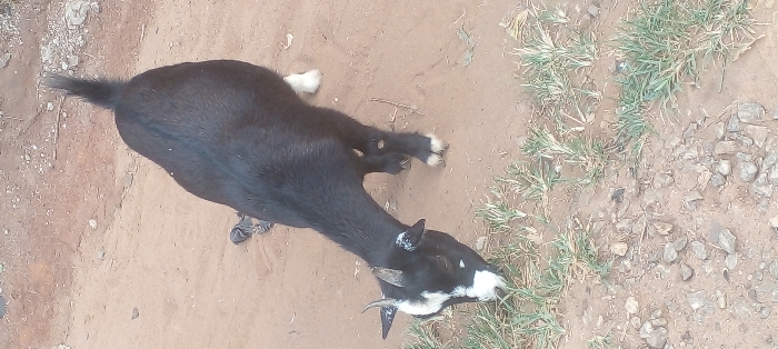 - "A black goat with white markings on its face and legs grazes on a patch of green grass" by FM-7exiW2, licensed under CC BY 4.0