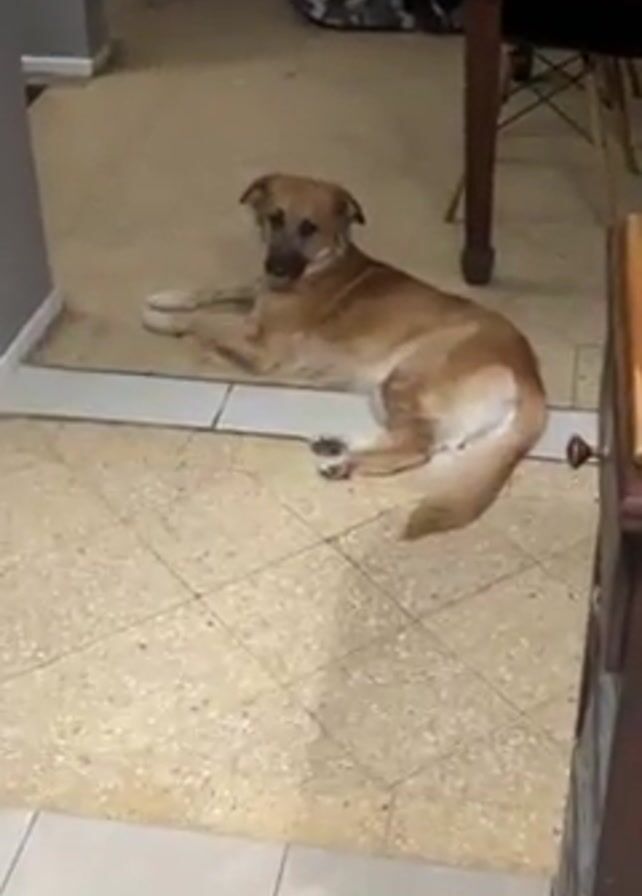 medium-sized dog lying on a tiled floor. The dog is mostly light brown with darker fur on its snout and lighter fur on its paws and tail. It's resting in a kitchen or dining area, with a wooden table and chairs visible in the background. The floor is a mix of beige and white tiles. A gray refrigerator is partially visible on the left. Someone is calling the dog's name repeatedly, "Kali, Kali, Kali, Kali, Kali, Kali, Kali."