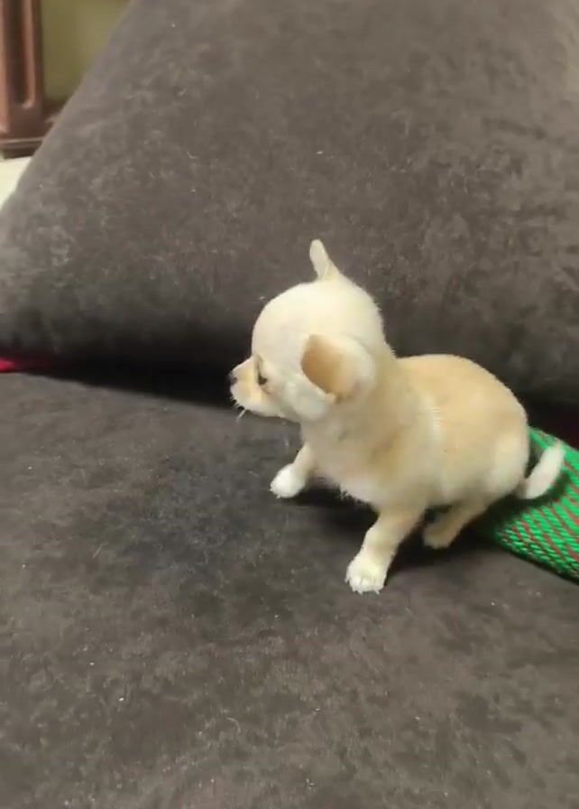 - "A tiny, light-colored Chihuahua puppy stands on a brown, textured cushion next to a colorful crocheted rope toy" by FM-BjNp73, licensed under CC BY 4.0