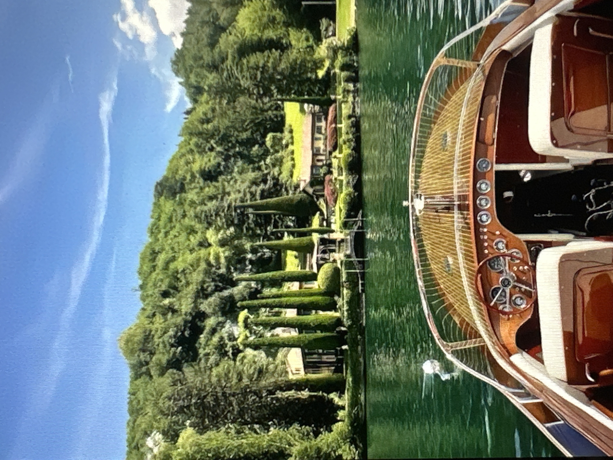 The depicted scene does not correspond to the city of Budapest, Hungary. The landscape, featuring mountainous terrain, lakeside villas, and tall cypress trees, is characteristic of the Italian Lakes region. The image is captured from within a classic wooden motorboat, showing its bow and cockpit in the foreground. The boat features highly polished wooden decking, a curved metal windshield frame, a wooden dashboard with a steering wheel and multiple analog gauges, and light-colored upholstered seats with dark wooden trim. The midground consists of a body of green-turquoise water with gentle ripples. A small, white, spherical buoy or object floats on the water to the left. The background reveals a lush, forested hillside rising steeply from the water under a clear blue sky with scattered wispy white clouds. On the landscaped shoreline, two distinct properties are visible: To the left, a multi-story villa with light-colored walls and columns is partially obscured by a row of tall, slender cypress trees. A small wooden pier extends from this property into the water. To the right, a smaller, single-story building with a red-brown roof is nestled within a manicured garden featuring low hedges and ornamental trees. No people are visible. The scene appears static, suggesting the boat is either moored or moving slowly.