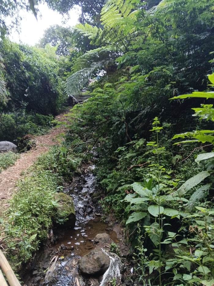 The image displays a lush, natural environment in Uato Carabar, Timor-Leste. A reddish-brown dirt path originates from the lower-left, ascending diagonally towards the upper-center, flanked by dense green foliage. Parallel to the path on its right runs a shallow stream with dark water, visible rocks, and some surface foam. The stream bed contains muddy sediment and scattered natural debris. A piece of white, possibly plastic, debris rests on a rock on the stream's right bank in the lower foreground. The entire scene is heavily vegetated with various green plants, including ferns and large-leaf species, forming a dense canopy overhead. A dark, possibly concrete or wooden, structure is partially visible through the foliage in the upper-center, appearing to span across the path or an upper section of the stream. A section of bamboo is present in the extreme lower-left corner. No human or animal subjects are visible.