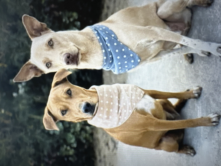 Two dogs lie on a concrete surface. The top dog is a light tan color wearing a blue bandana with white polka dots. Its head is tilted upwards, looking at the camera. The bottom dog is brown wearing a cream-colored bandana with white polka dots. It also looks at the camera with its head tilted. Background vegetation is slightly visible on the left side of the image.