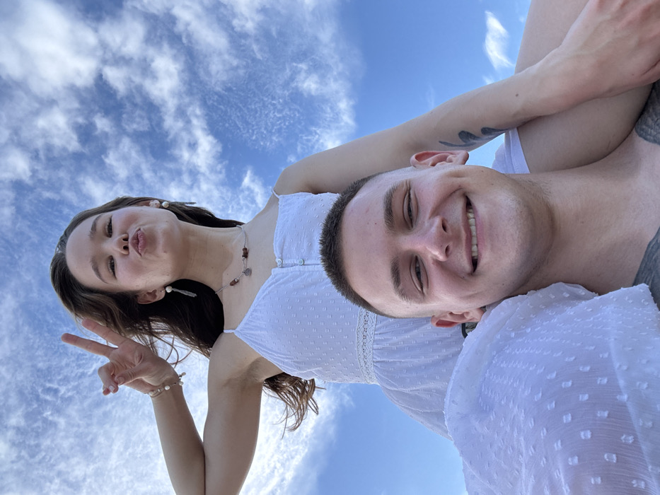This low-angle outdoor portrait, set against a blue sky with scattered cirrocumulus clouds in Nha Trang, Vietnam, depicts a female seated on the shoulders of a male