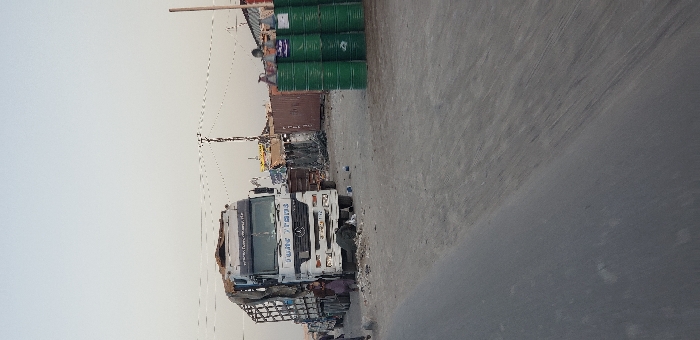 The image depicts a roadside scene in Kandahar, Afghanistan. In the left-to-center foreground, a white Mercedes-Benz semi-truck, displaying "DOME TRANS" lettering on its cab and equipped with a caged trailer carrying a covered load, is parked partially off a paved road surface onto a dirt shoulder. Two individuals are visible near the truck's front left side; one, dressed in traditional attire, stands facing the vehicle. Debris and waste are scattered on the ground in front of the truck. A second, smaller, darker truck is partially visible behind the semi-truck. To the right of the semi-truck, a stack of approximately ten green metal barrels, some labeled "Engine Oil," is arranged in two vertical columns, topped by three smaller, lighter-colored containers. A brown shipping container is situated behind these barrels. The background features several informal structures constructed from corrugated metal and other materials, beneath utility poles supporting multiple power lines. The sky is a uniform light grey.