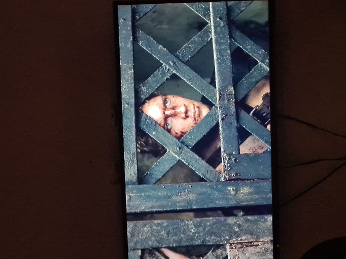 This image captures a flat-screen television displaying a scene, located within an indoor domestic setting in Kajola, Nigeria. The television screen features a close-up of a fair-skinned male with curly brown hair, his face marked with bloodstains on the forehead and nose. He is observed through a dark, gridded barrier composed of vertical and diagonal elements, resembling a cage or gate. The individual maintains a focused gaze towards the viewer's left. The television is positioned against a plain, light brown wall. Several dark electrical cables are visible extending downwards from the base of the television, against a dark, unlit background.