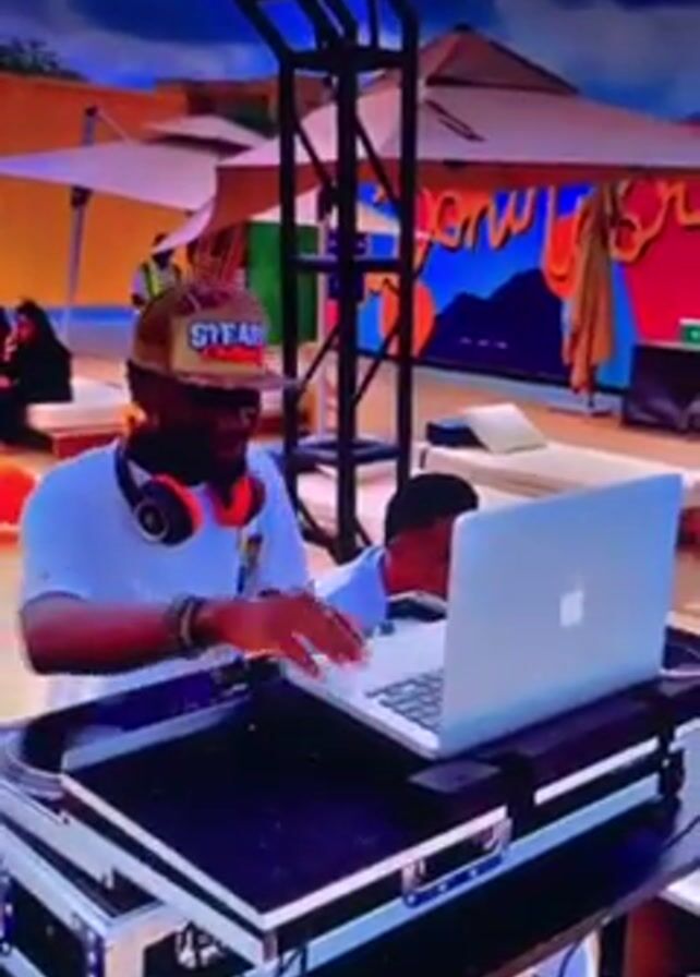 A medium shot reveals a DJ, wearing a tan and camouflage hat, a white t-shirt, and large headphones, standing behind a DJ setup at an outdoor event