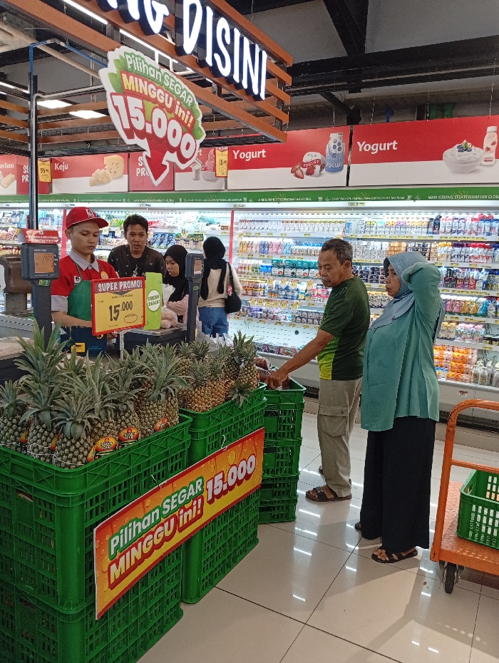 The image depicts the interior of a brightly lit supermarket located in Kecamatan Pati, Indonesia. In the foreground left, a male employee in a red uniform and cap stands behind a counter equipped with a digital scale and a "SUPER PROMO! 15.000" sign. Behind him, a man in a dark t-shirt and a woman in a black hijab stand, with another female partially visible behind them. In the mid-ground, an older man wearing a green t-shirt and cargo shorts reaches into one of several stacked green plastic crates filled with pineapples. He is accompanied by an older woman in a light blue hijab and dark pants, who stands next to him. A prominent sign attached to the pineapple crates reads "PILIHAN SEGAR MINGGU INI! 15.000". Overhead, an illuminated sign reiterates "PILIHAN SEGAR MINGGU INI! 15.000". The background features extensive refrigerated display cases stocked with various dairy products and beverages, indicated by signs for "Yogurt," "Keju" (Cheese), and "Susu" (Milk). The floor is tiled, and an orange and green shopping trolley is partially visible on the far right.