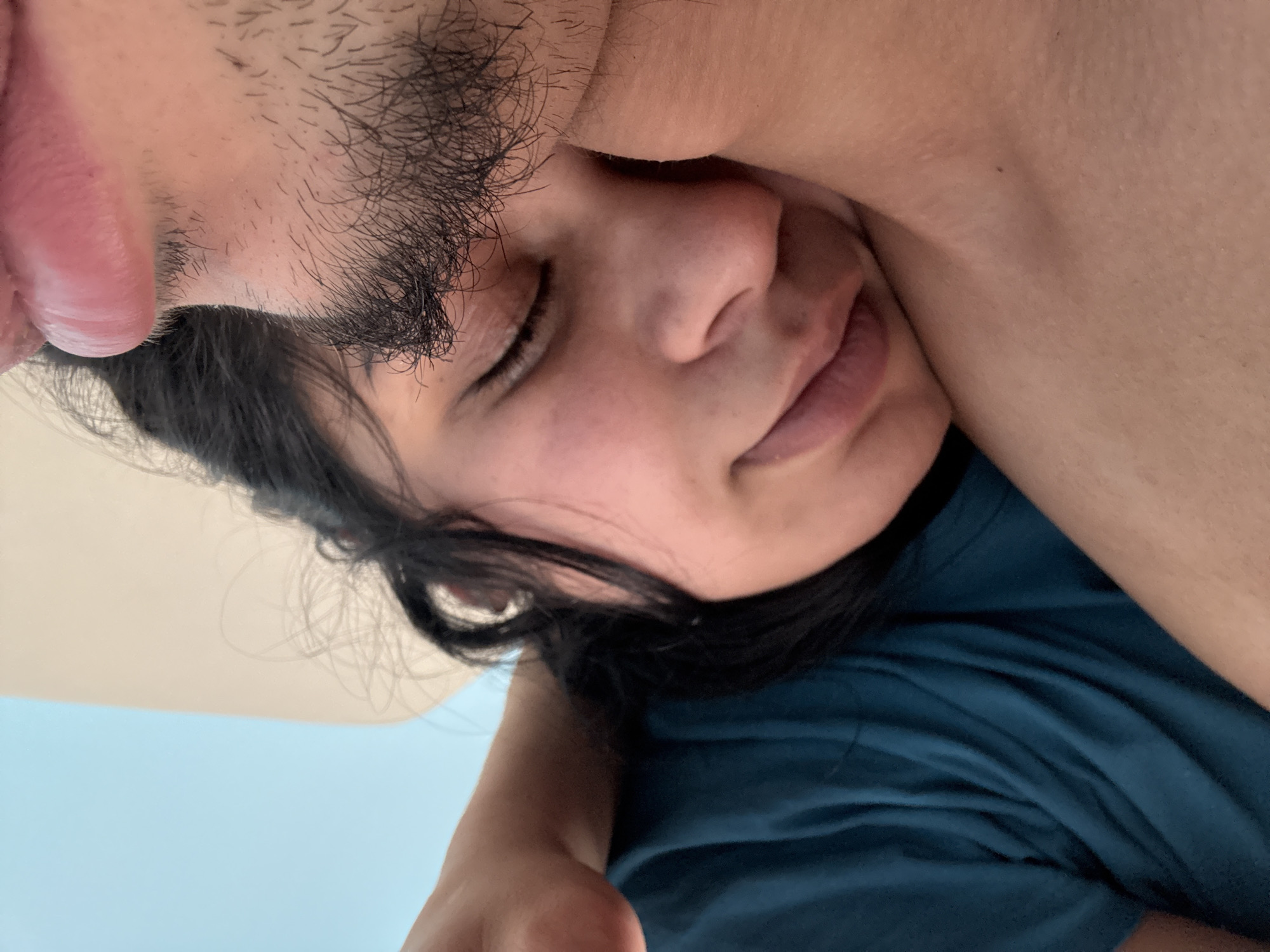 The image depicts two individuals in close physical contact within an indoor setting, located in the city of Kastel, Bulgaria. In the foreground, an adult individual with light-to-medium skin tone, dark hair, and visible facial stubble on the upper lip and chin is shown with closed eyes and full lips, resting their head against the arm and torso of a second individual. The second individual, partially obscured, also exhibits light-to-medium skin tone and wears a teal-colored garment. The background consists of a plain light beige surface on the right and a light blue surface in the upper portion. Both individuals appear to be in a state of repose or sleep.